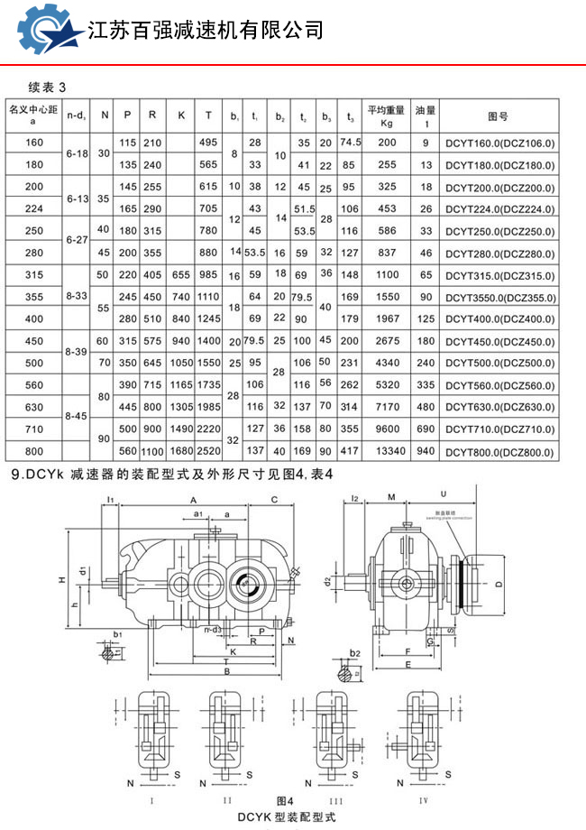 2.2.3工作环境温度为—40-45℃。当环境温度低于0℃时,启动前润滑油应加热(另配电热管)。3、减速器型式与标记3.1型式3.1.1 DBY型为二级传动硬齿面齿轮减速器;DCY型为三级传动硬齿面齿轮减速器,**级传动为格里森弧齿锥齿轮,第二、第三级传动则为渐开线圆柱斜齿轮。3.1.2减速器按出轴形式可分I、Ⅱ、Ⅲ、Ⅳ四种装配型式,按输出轴旋转方向可分顺时针(S)和逆时针(N)两种。(面对输出轴) 需配置逆止器应另外声明。